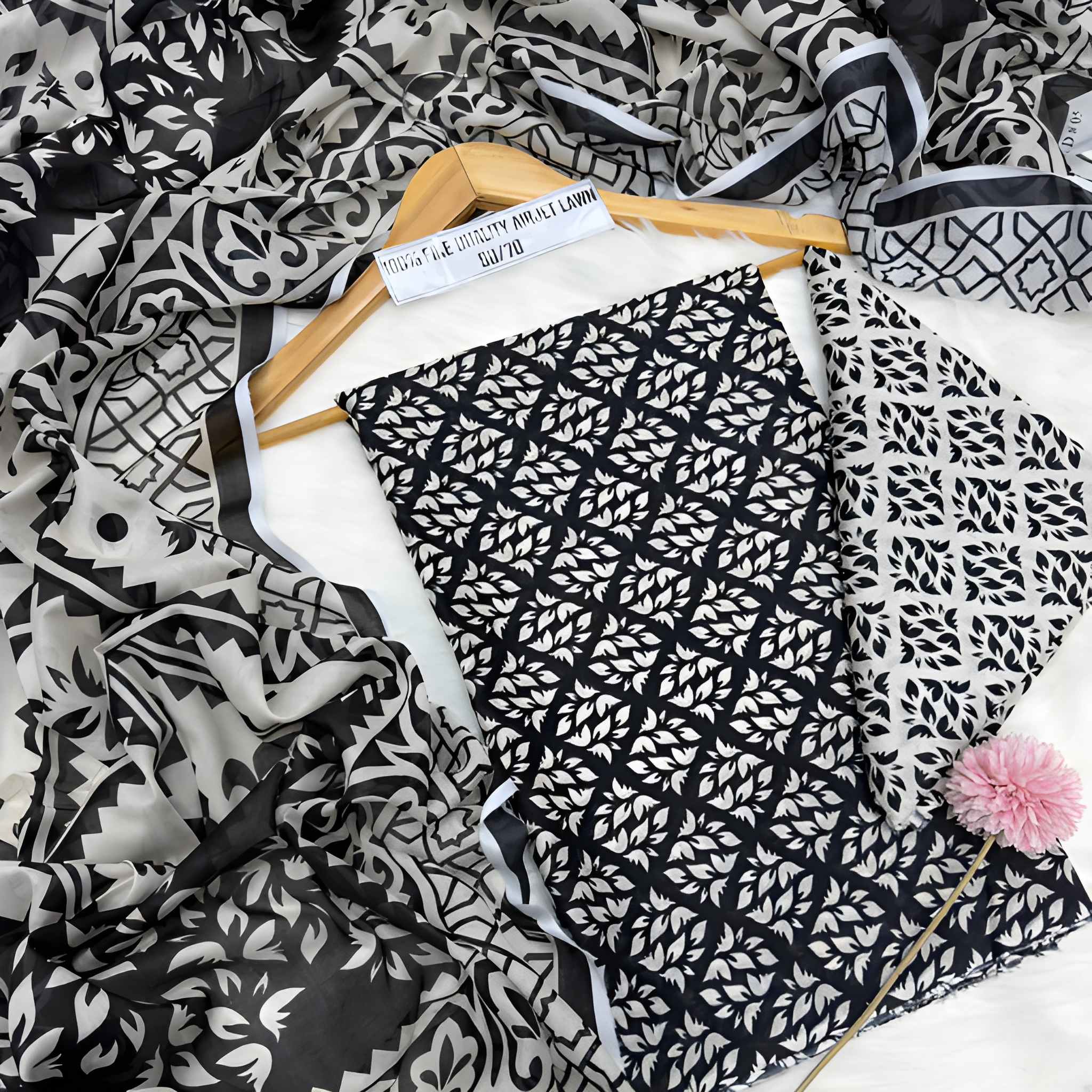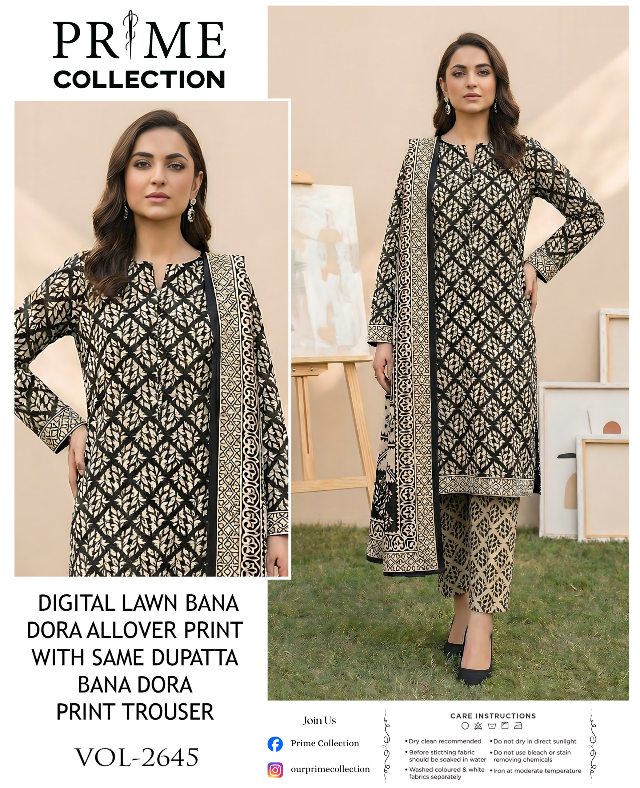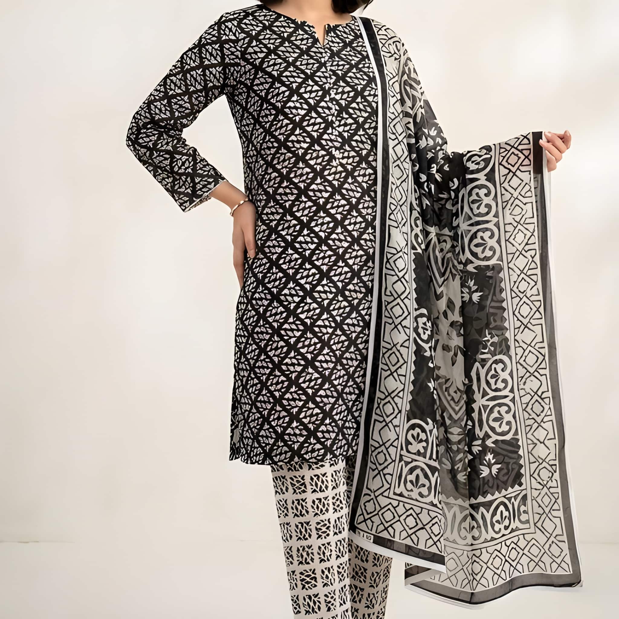 Embrace the ultimate fashion staple with our Digital Lawn Bana Dora Allover Print in a sharp black and cream colorway. This three-piece suit is designed for the modern woman who values high-contrast aesthetics and superior fabric quality, making it a perfect choice for both professional and social settings.