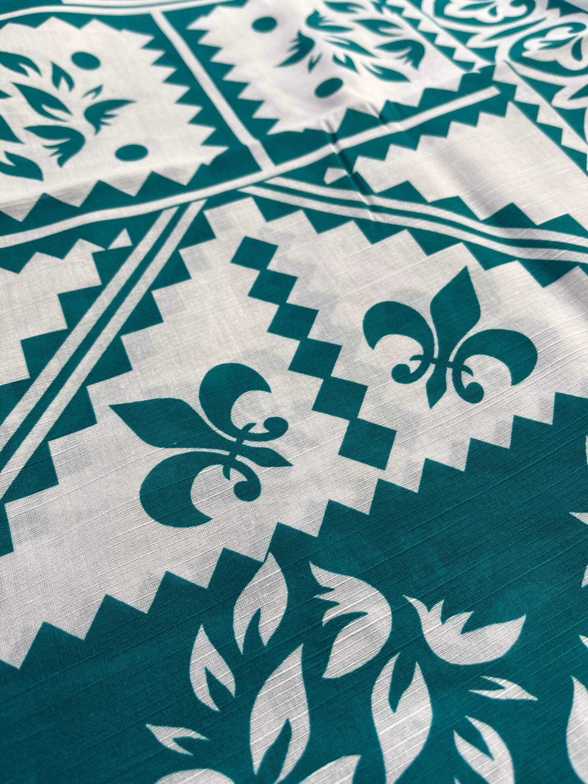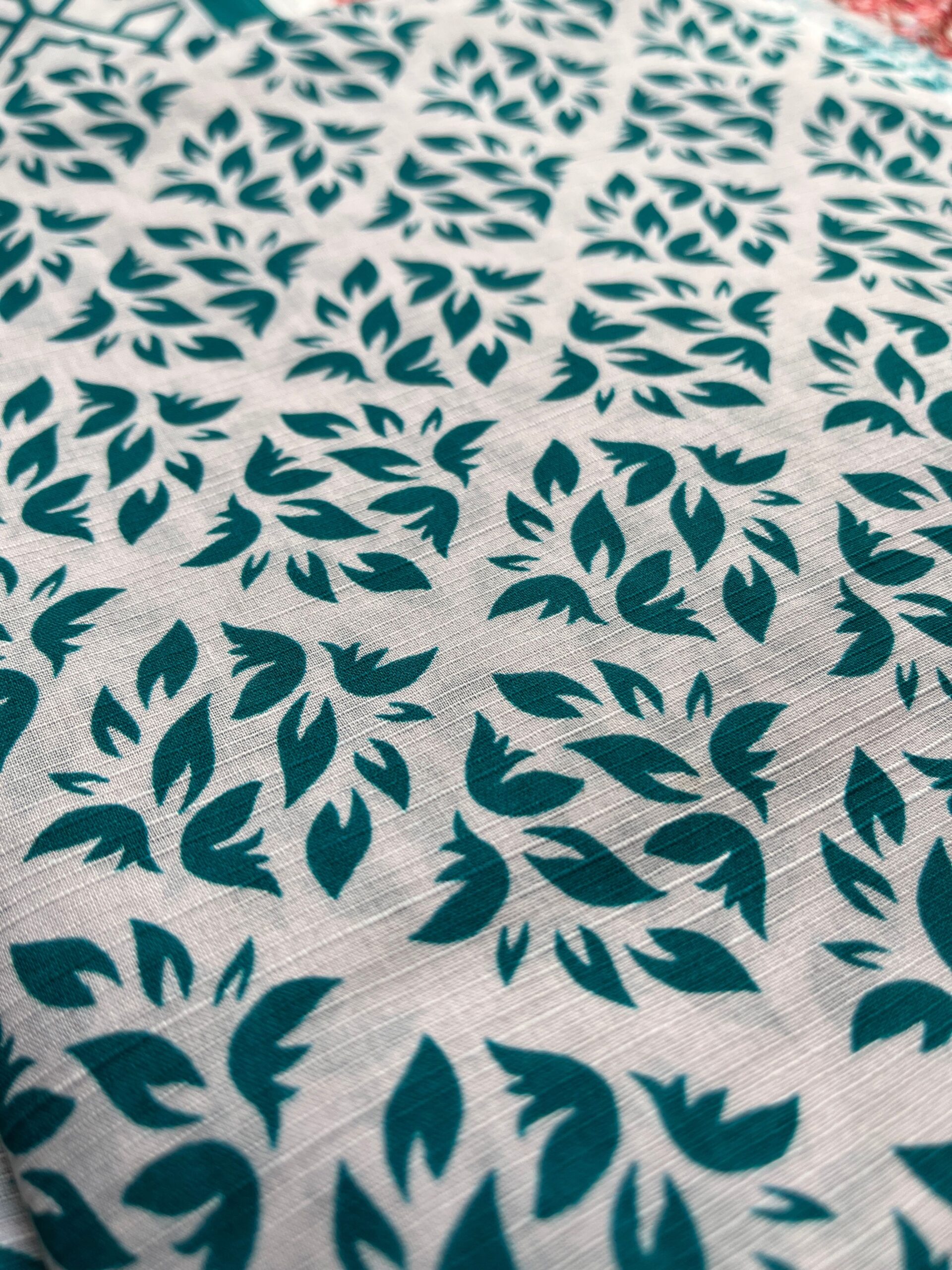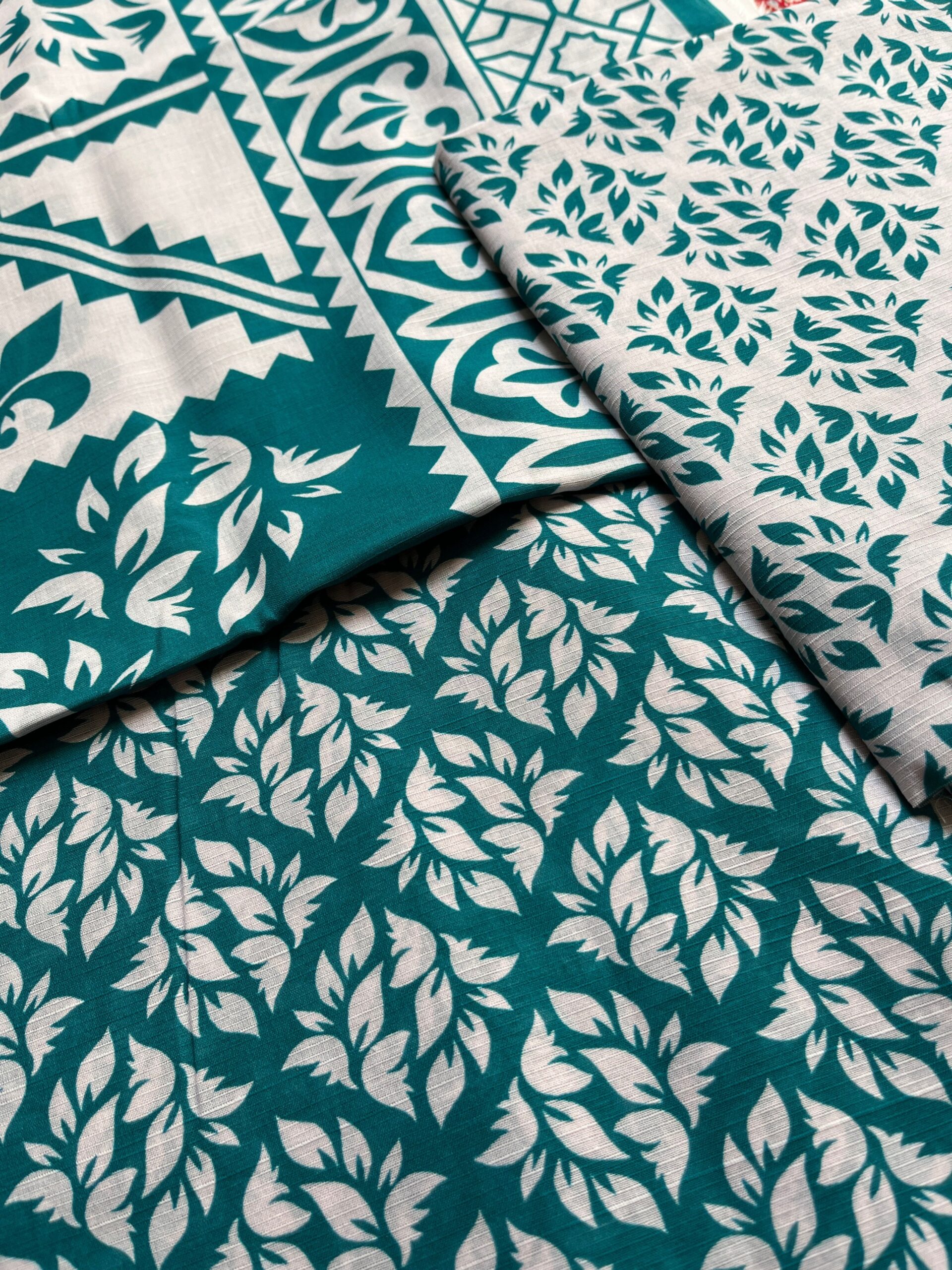 Discover effortless elegance with this Digital Lawn Bana Dora 3-Piece Suit in a refreshing teal and seafoam green palette. This unstitched ensemble features a stunning geometric allover print, a matching Bana Dora dupatta, and printed trousers, perfect for staying stylish and cool this season.