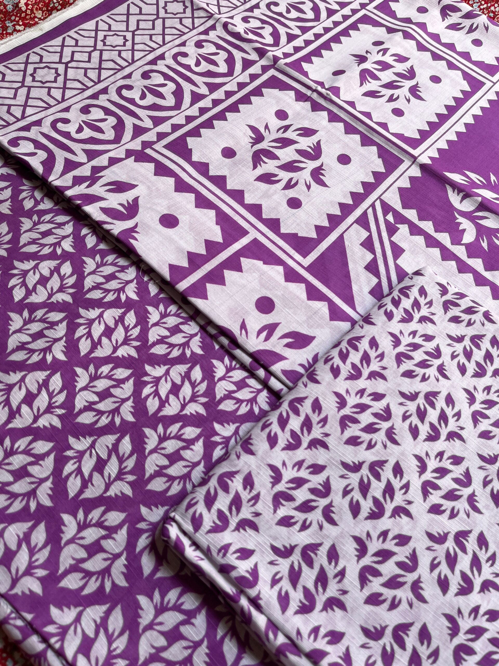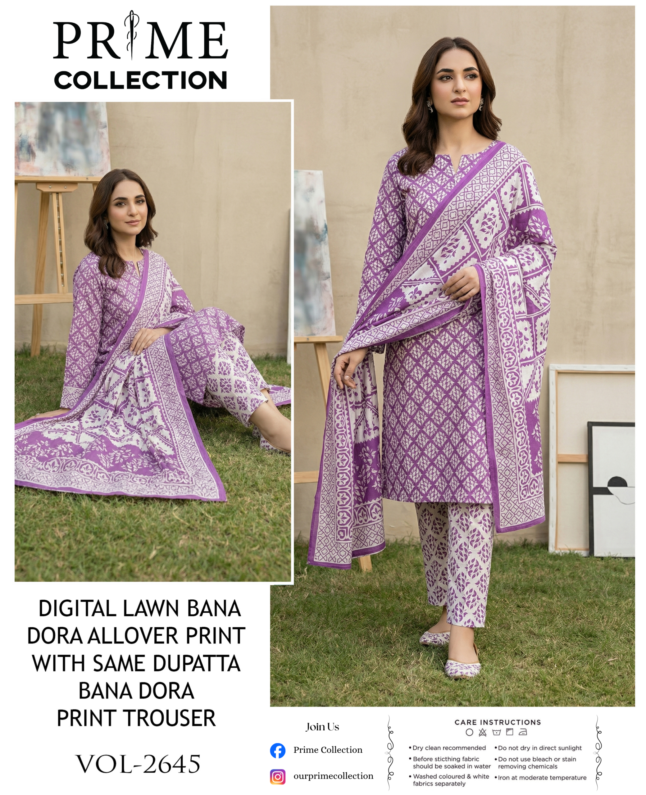 Embrace the beauty of soft hues with our Digital Lawn Bana Dora Allover Print in a stunning lavender and lilac palette. This three-piece suit is a testament to delicate design and premium fabric quality, making it an essential addition to your seasonal collection.